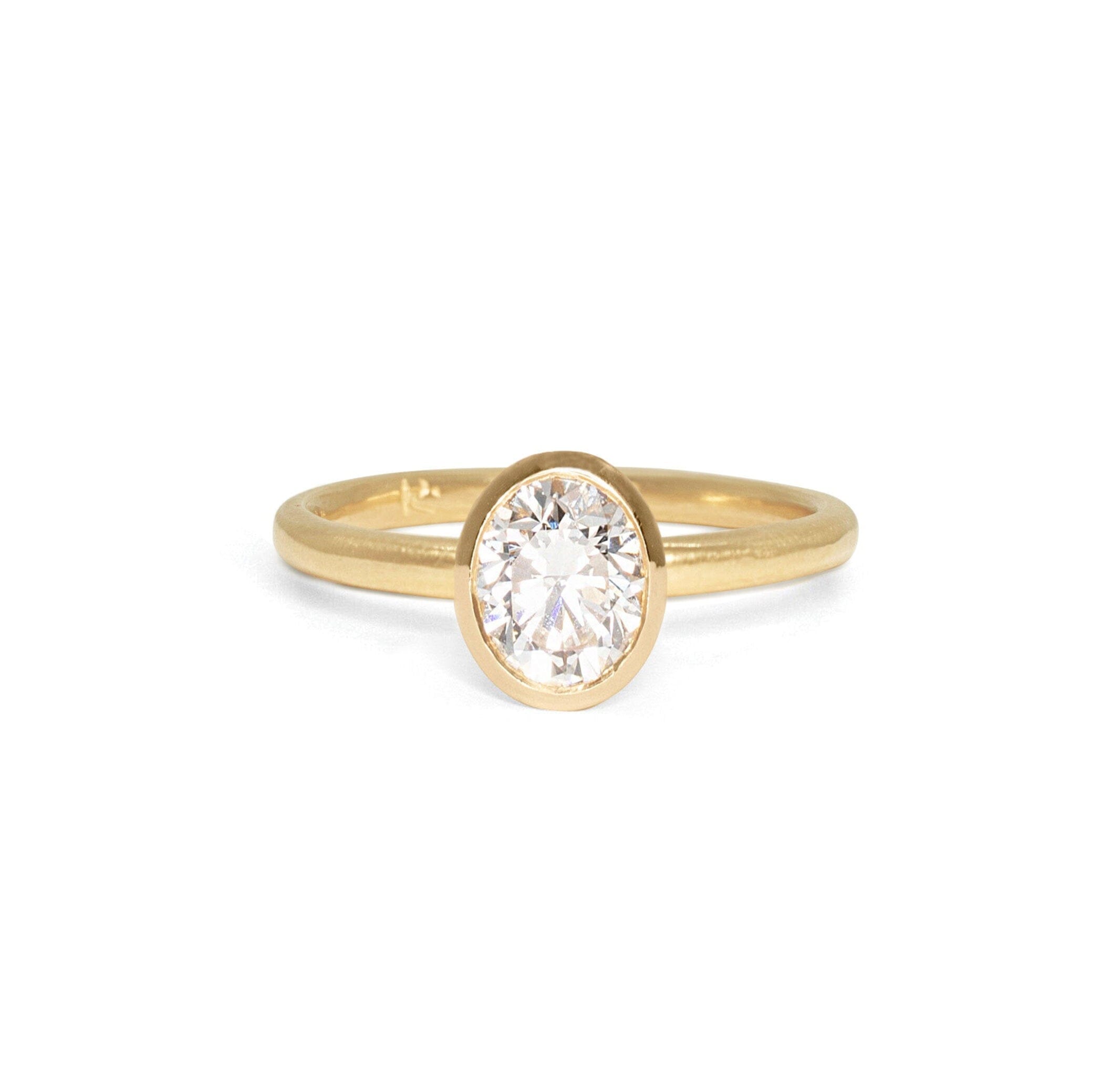 The Madison style is an elegant and classic ring with a timeless appeal. This ring set with a smooth bezel setting in a soft cup setting shape. with a center stone of your choosing. The 2 millimeter wide rounded smooth band can also be customized with our handcarved texture on request. This style is set low to the finger and sits perfectly with our custom curved wedding bands.