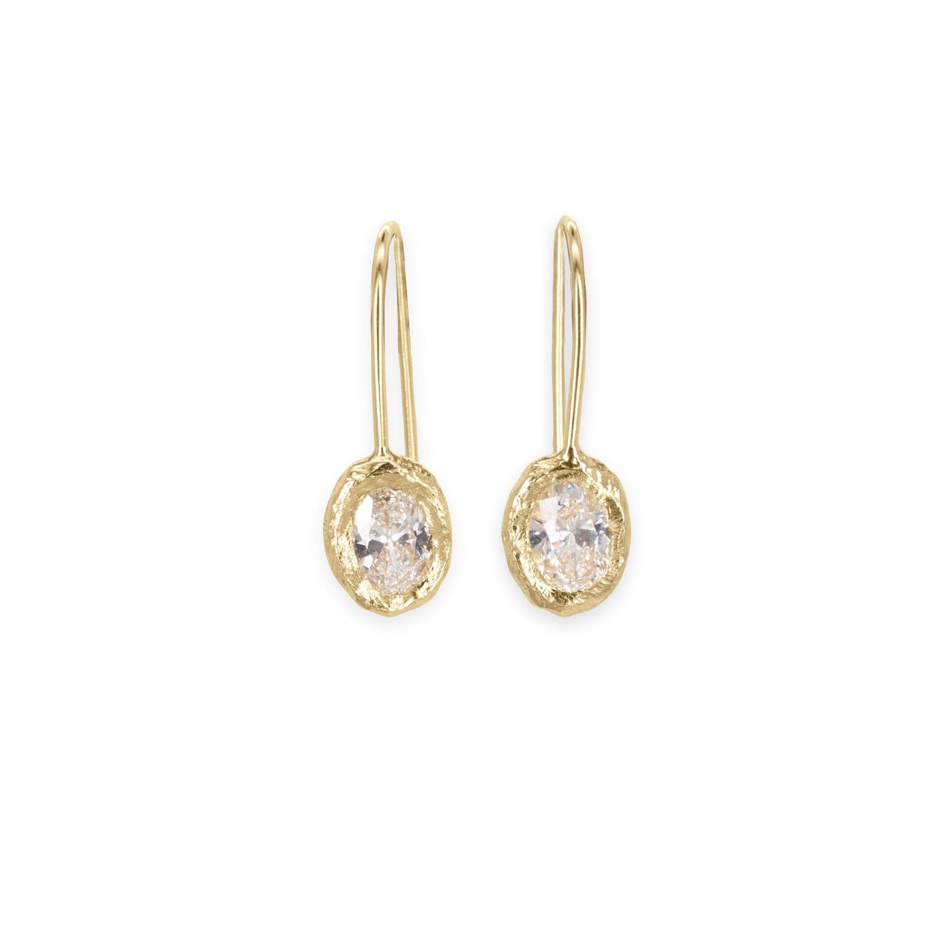 Details: Material: 18K yellow gold Diamonds: Brilliant cut oval diamonds each weighing 0.45 carats, .90 carats total per pair, each measuring 6 x 4 millimeters, I/J color with VS/SI clarity Dimensions: Total length 3/4" from hook to base, hand carved textured bezel