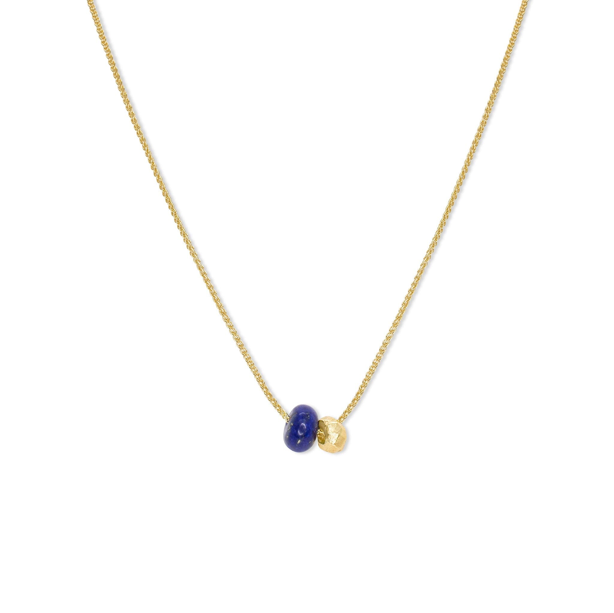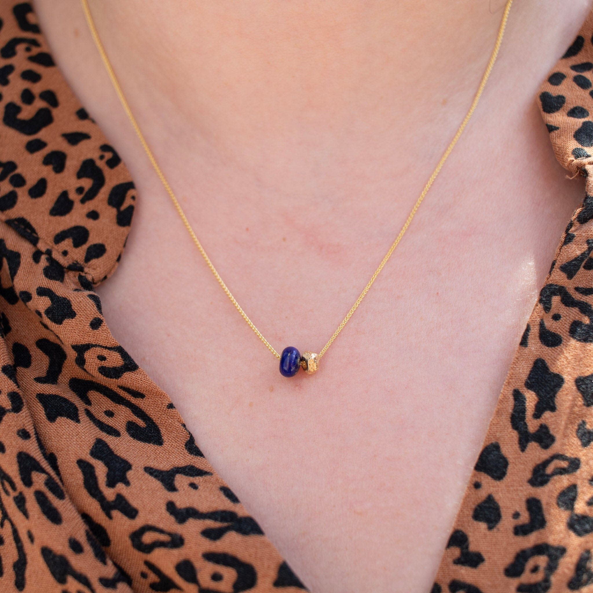 Our beaded gemstone necklace collection features a vibrant natural gemstone with one hand carved textured gold bead on a silky woven 18 karat chain. The adjustable 16-18 inch length chain makes it perfect for layering.