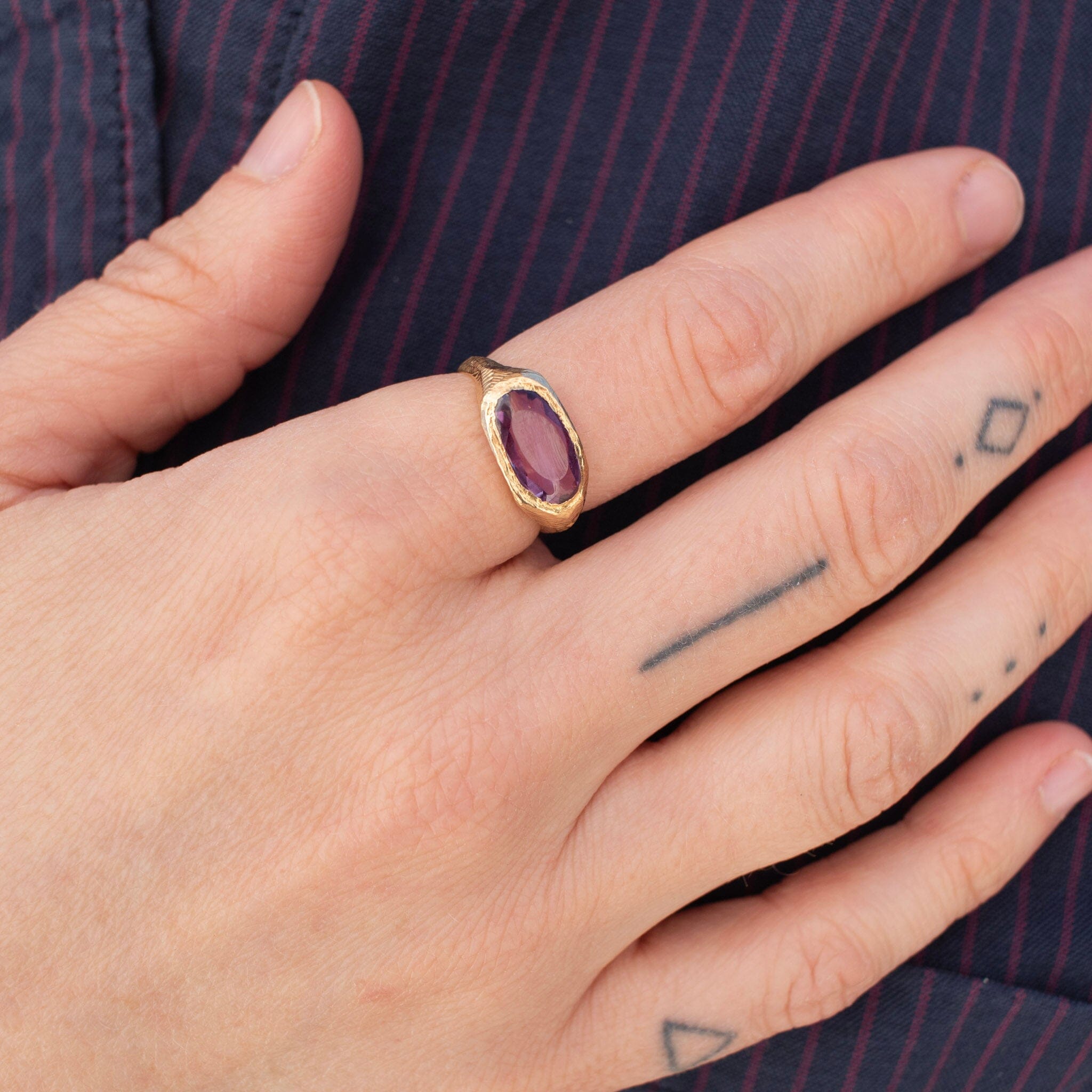 Measurements: Tapered ring shank is 2 millimeters at its narrowest, ring surface is approximately 8-10 millimeters wide. Each ring is unique, as a result some variation in shape, size and texture is expected.