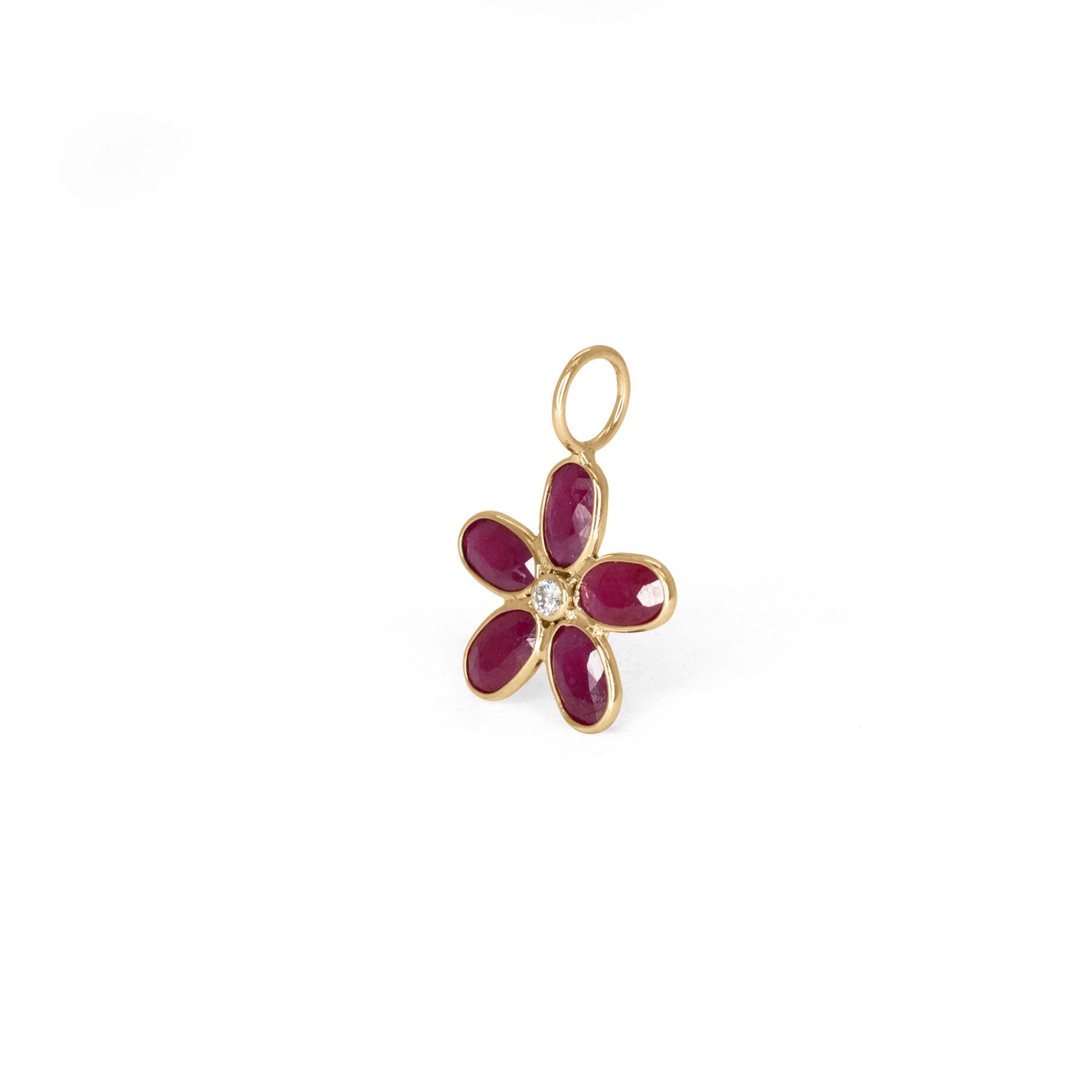 A cluster of five bezel set rubies surrounds a single diamond center, forming a delicate flower charm in solid 18K yellow gold. The vibrant rubies and subtle diamond sparkle create a playful yet timeless piece.