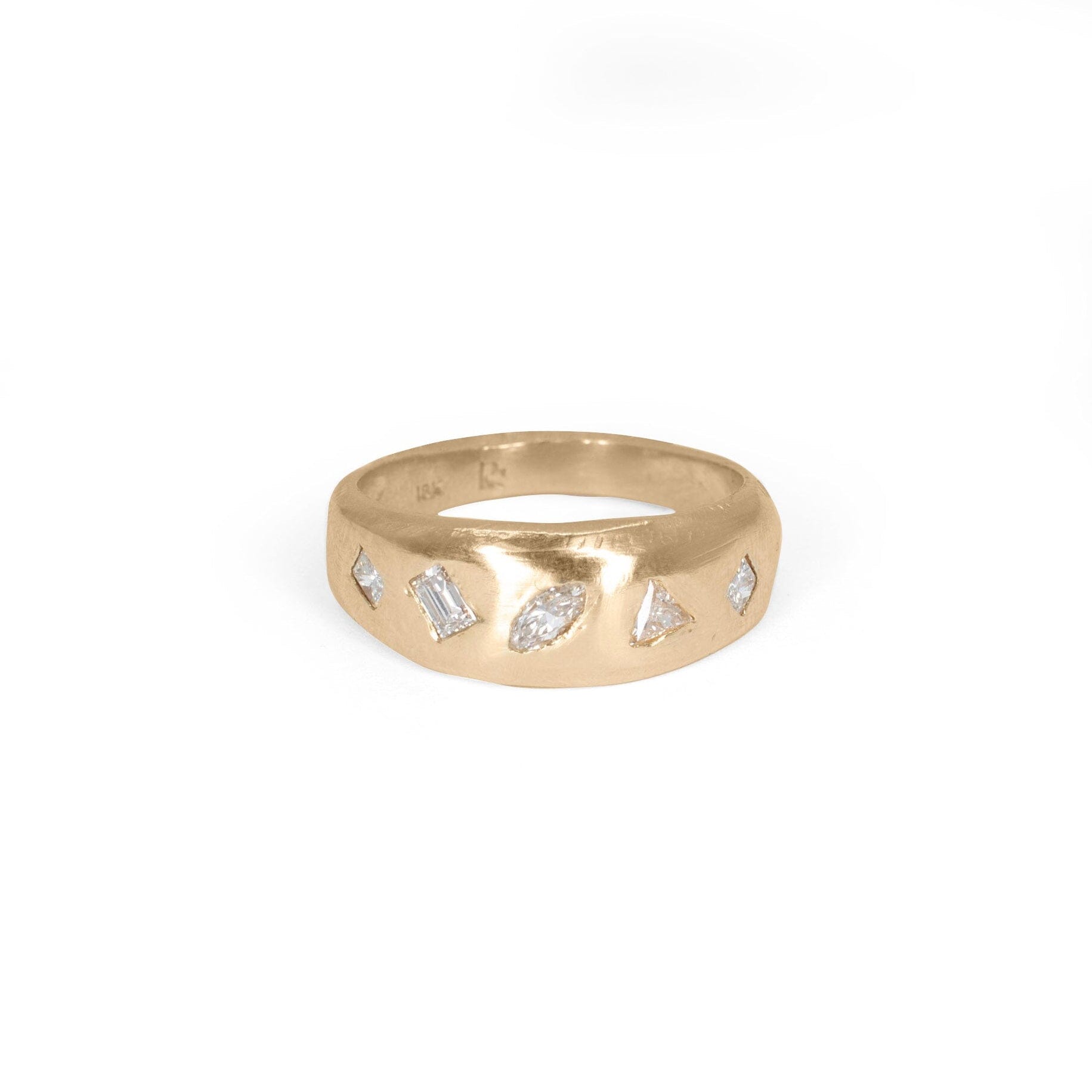 This one of a kind sculptural 18 karat gold ring features 5 geometric diamonds set in the surface, with softly domed and tapered design that narrows towards the back for comfort. This hand carved ring is finished with a smooth organic surface and just a hint of our signature brush stroke texture.