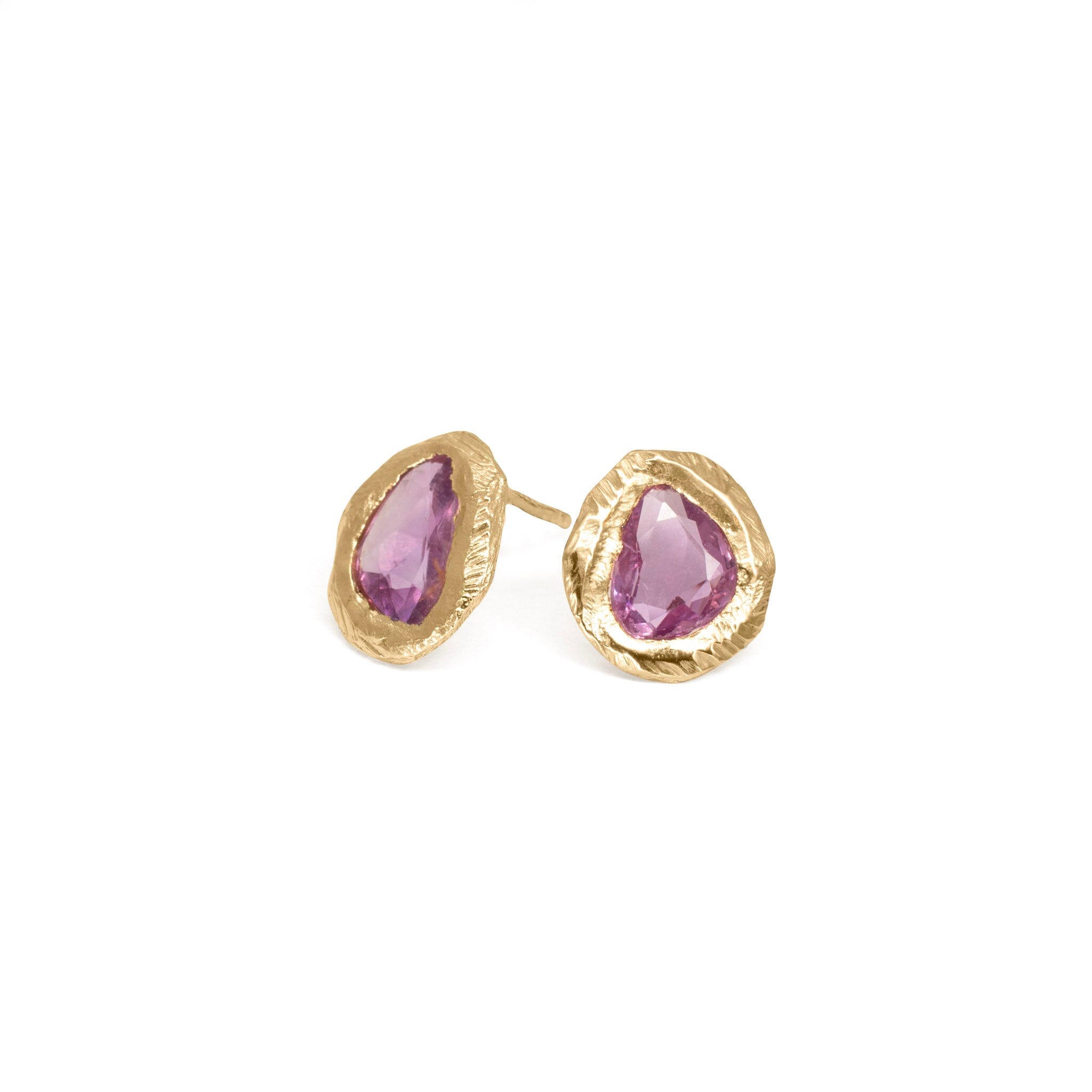 These earrings feature vibrant rose cut sapphires set in hand carved textured 18 karat gold bezels with a brushed satin finish. The freeform shape means no two pairs are exactly alike, each is unique to you. The post style earring lays comfortably flat against the ear.