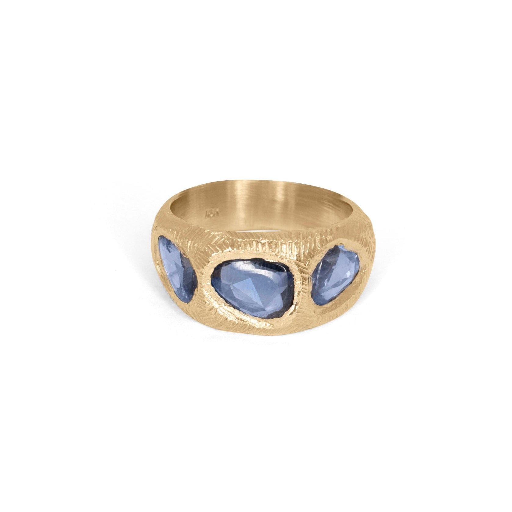 A sculptural 18 karat gold hand carved ring with 3 vibrant freeform rose cut sapphires in bright blue and deep blue. Featuring our carved texture and a brushed satin finish, this tapered statement ring is comfortable for everyday wear. Each ring is unique, no two are alike.