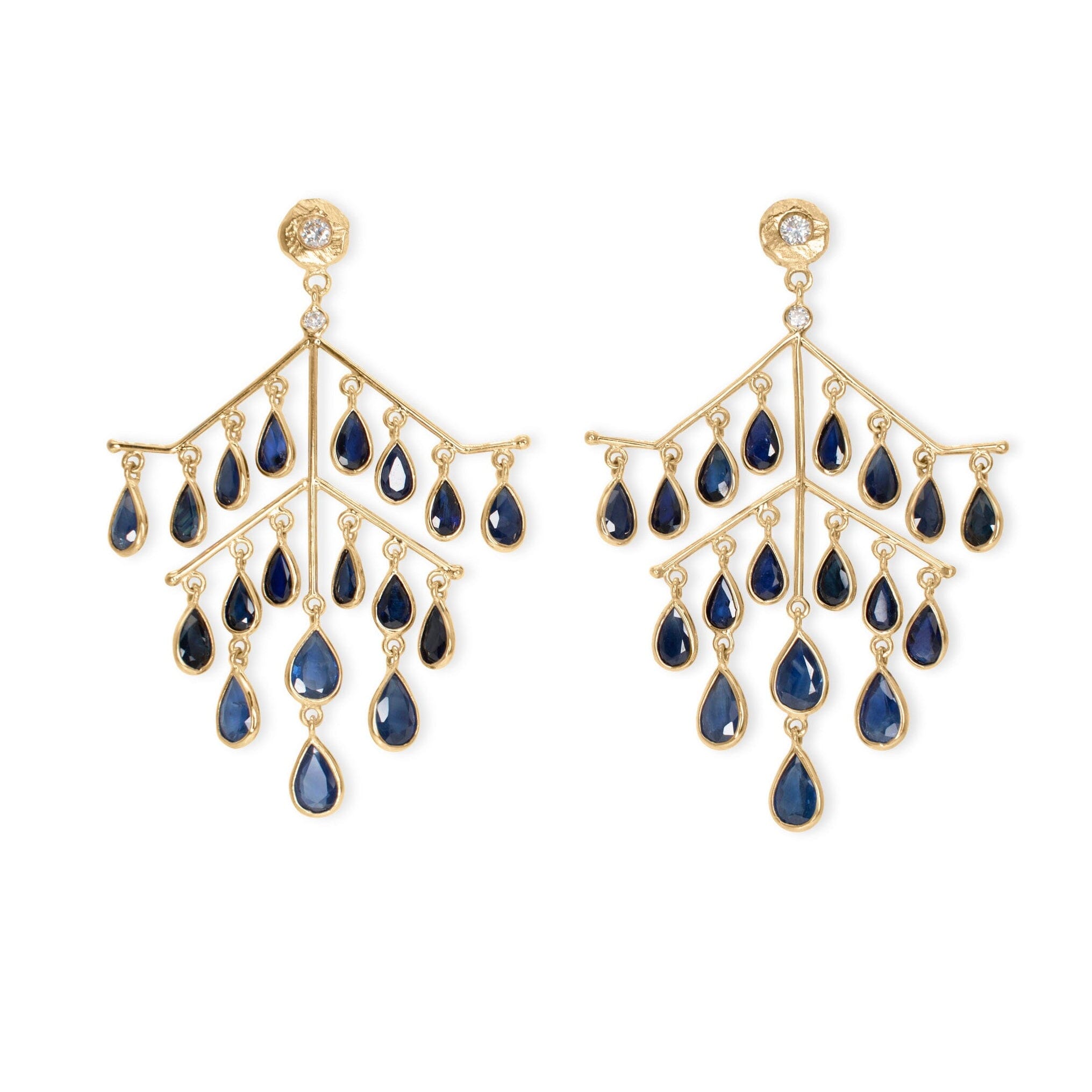 These stunning statement earrings are light enough to wear all day. Handcrafted in 18k yellow gold, they feature four rows of teardrop blue sapphires and are topped with our diamonds by the yard stud.Ā
