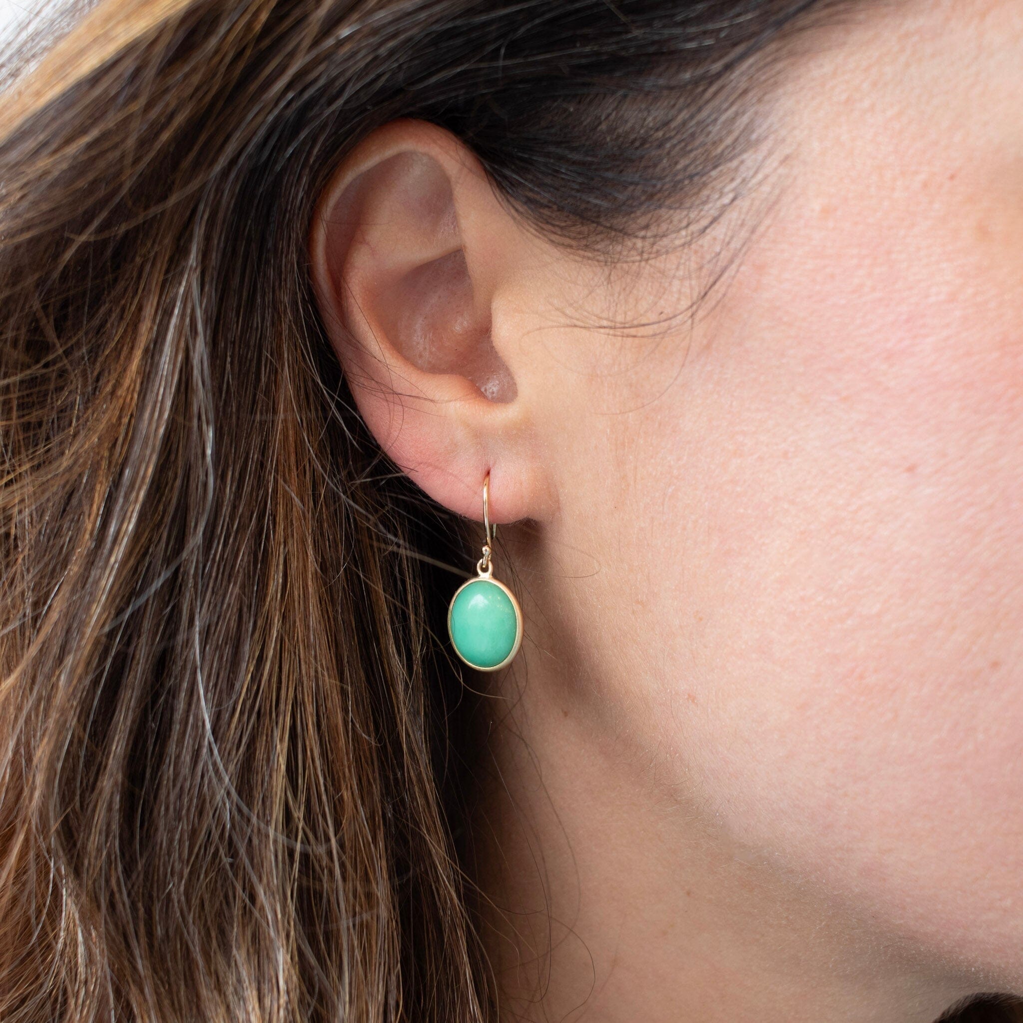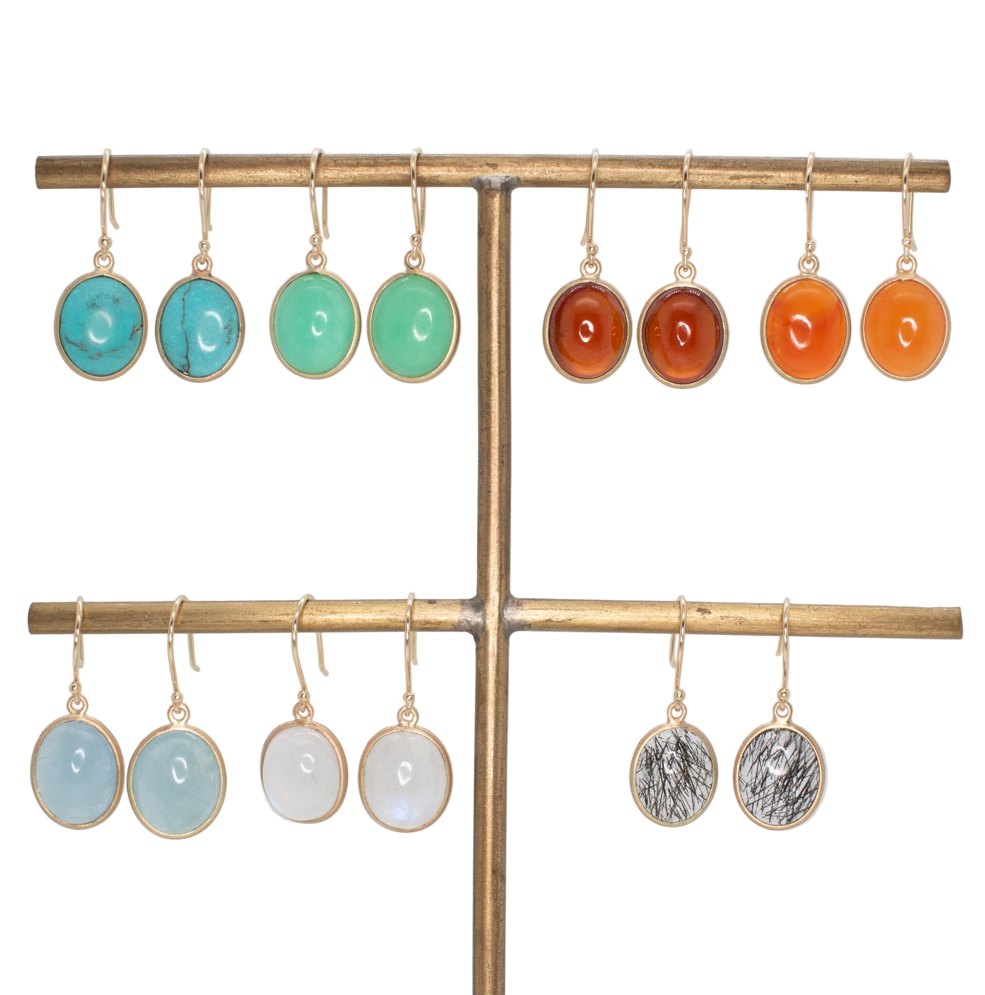 Add a pop of color or subtle elegance to your collection with our 10K gold bezel-set cabochon earrings. The light-weight earrings capture light and attention beautifully as they dangle.