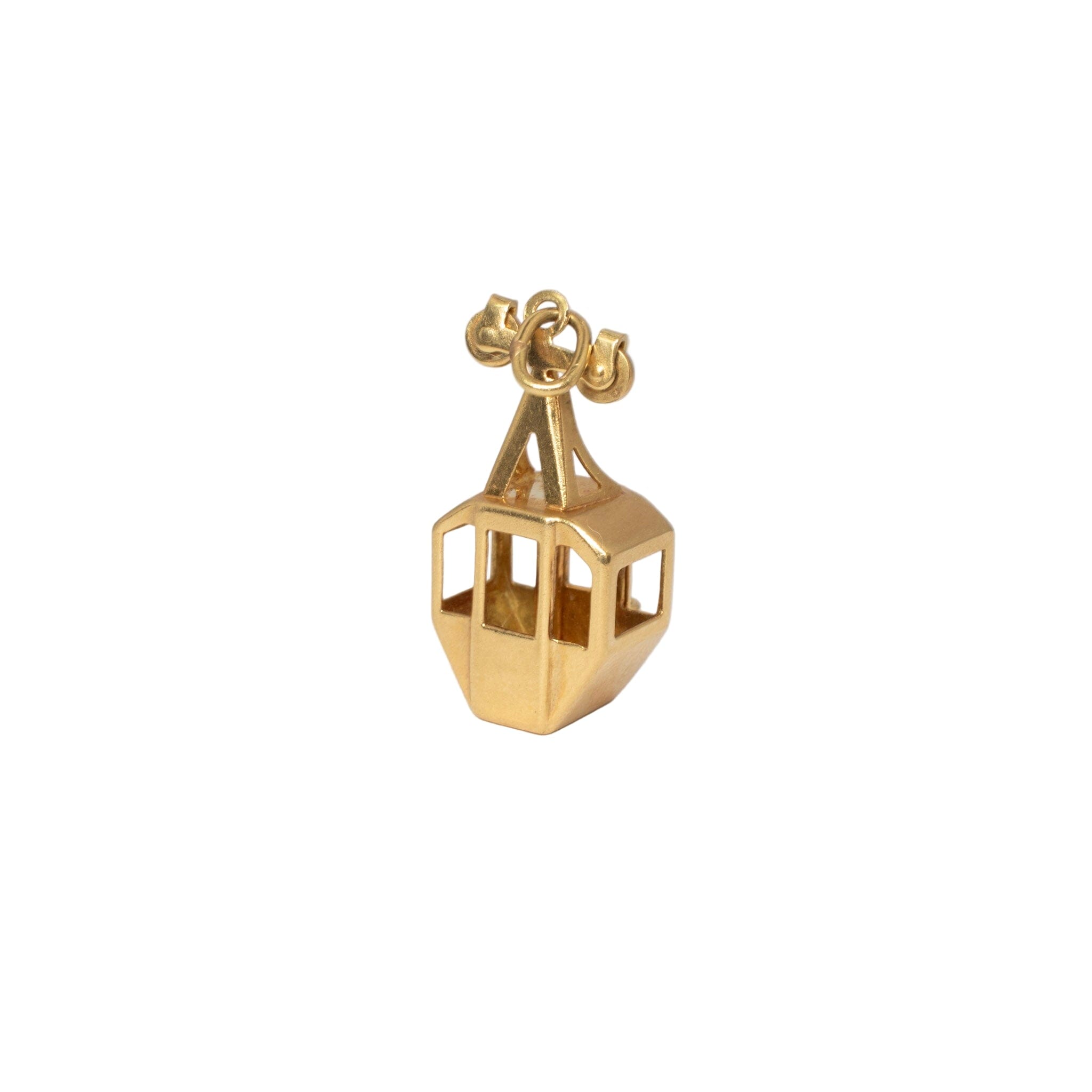 A rare and beautifully crafted vintage charm in rich 18K yellow gold, designed in the form of an aerial tramway or cable car. Meticulously detailed with open windows and smooth contours, this miniature captures the spirit of adventure and the elegance of mid-century travel. Its solid gold construction gives it a satisfying weight and a radiant finish, making it a standout piece on any charm bracelet or chain.