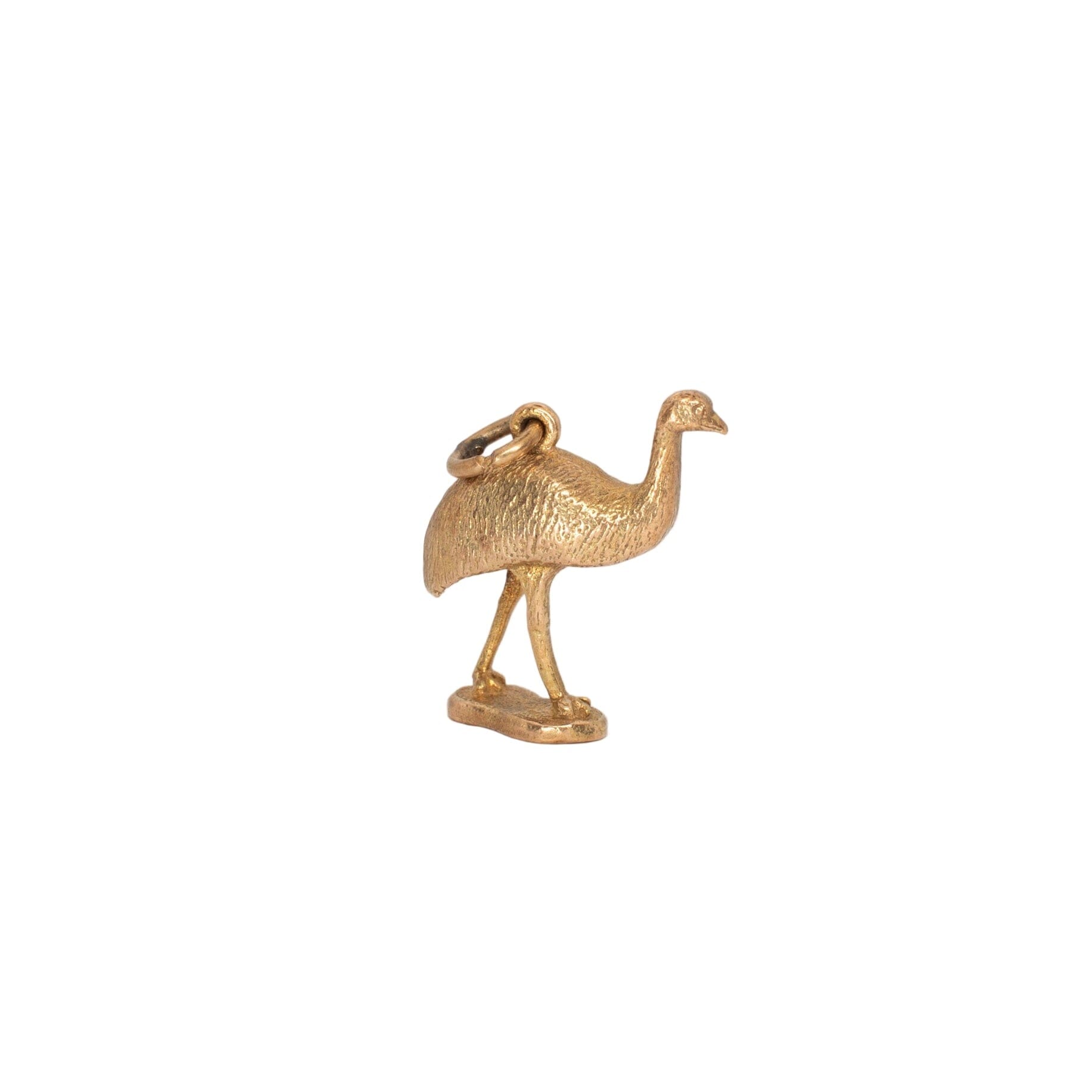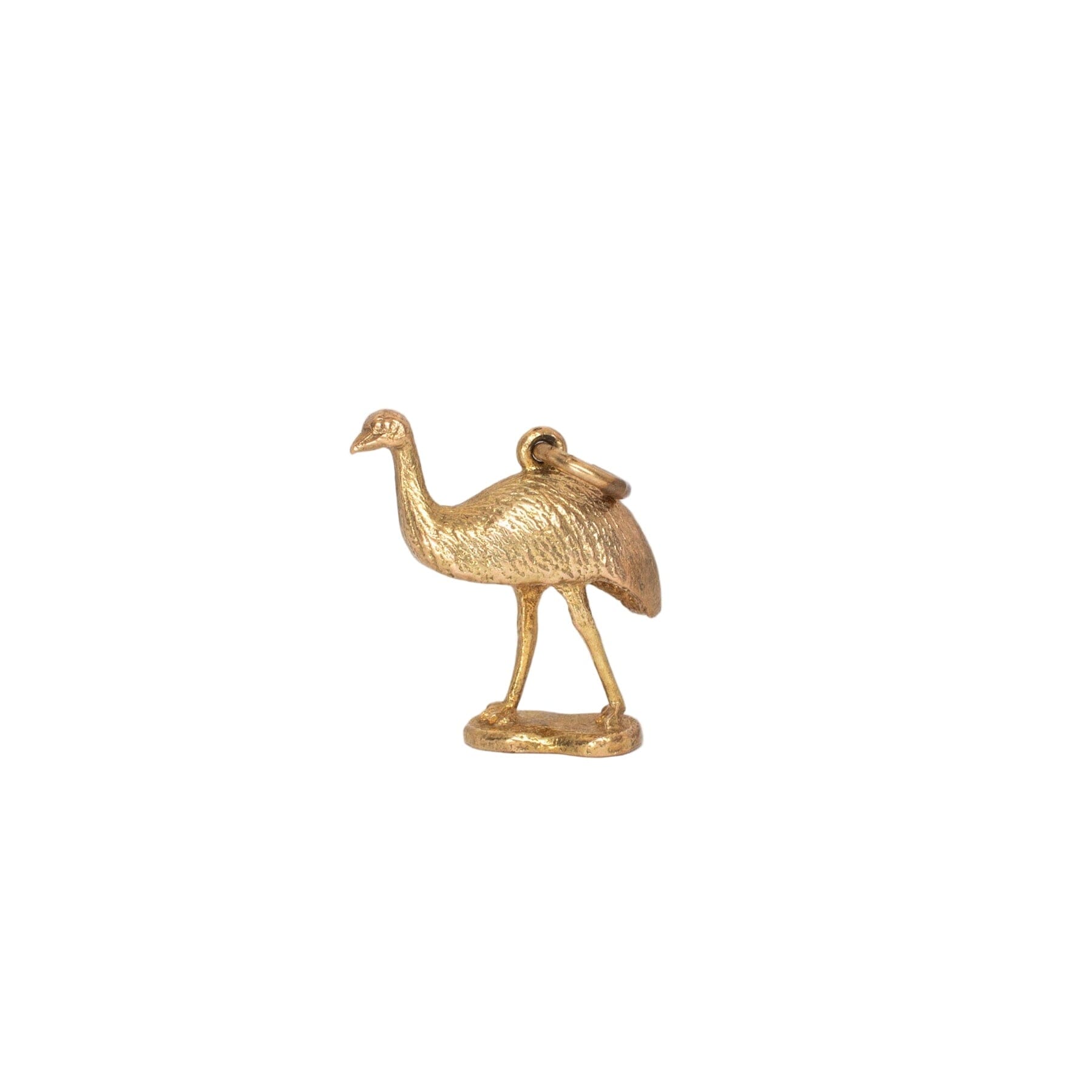 A charming vintage charm crafted in 9K yellow gold, depicting an emu (or ostrich) with delicate detailing that captures the birdโs distinctive features and character. Perfect for animal lovers or collectors of whimsical vintage charms, this piece adds personality and charm to any bracelet or chain.