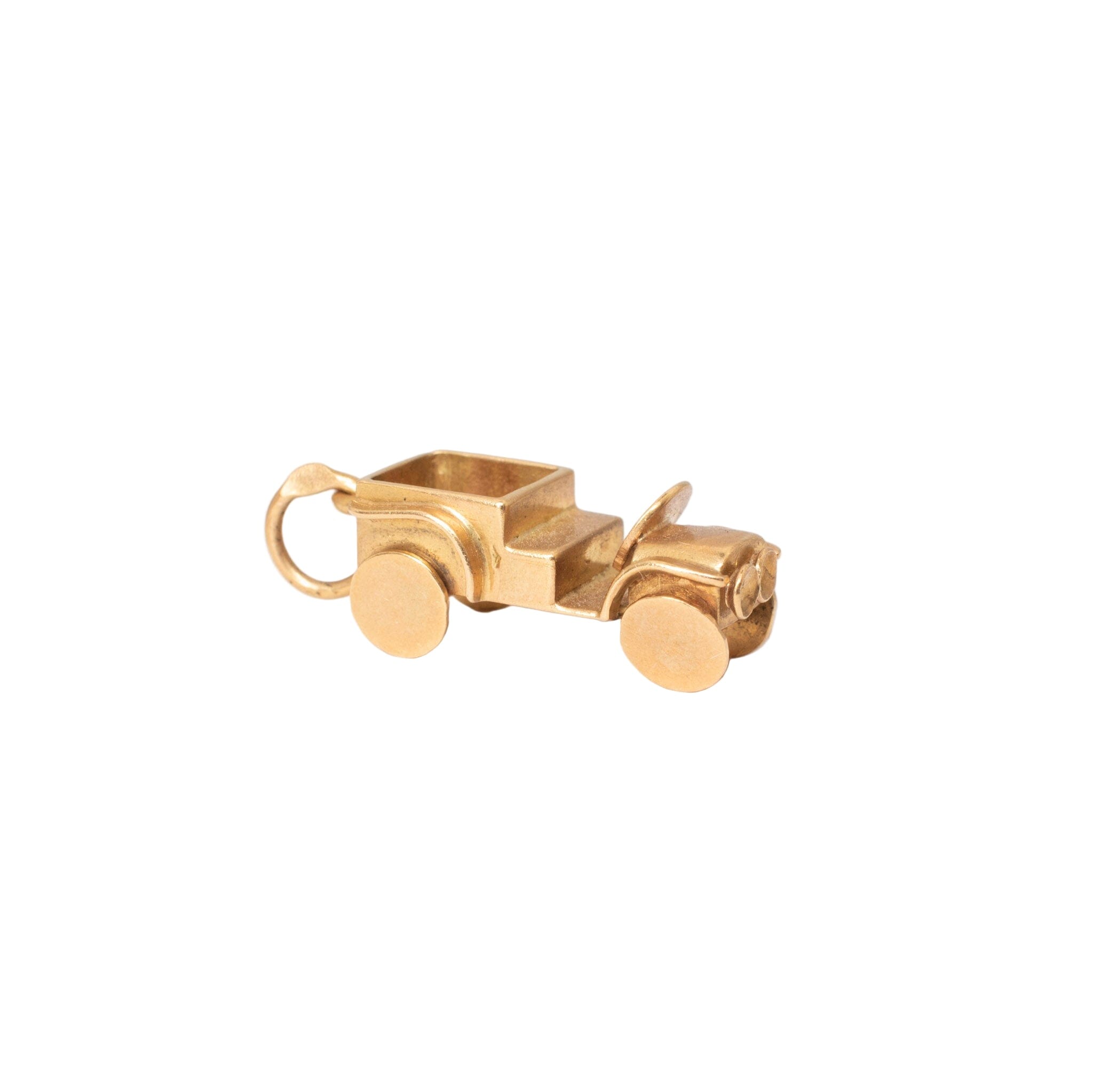 A delightful vintage charm crafted in 18K yellow gold, designed as an old-time car with intricate detailing and wheels that actually move. This whimsical piece captures the charm of a bygone era, making it a perfect addition to any collectorโs assortment or a standout pendant on its own.