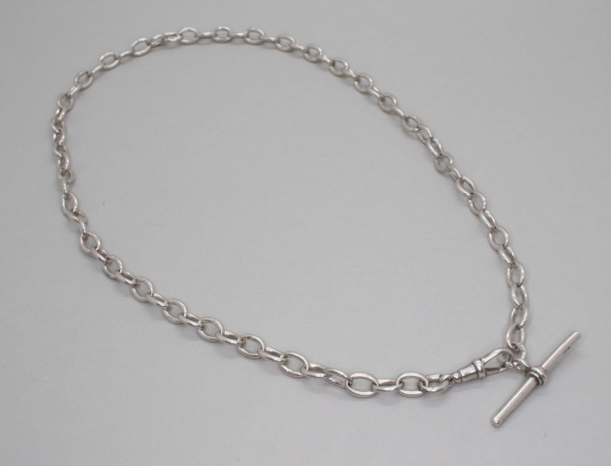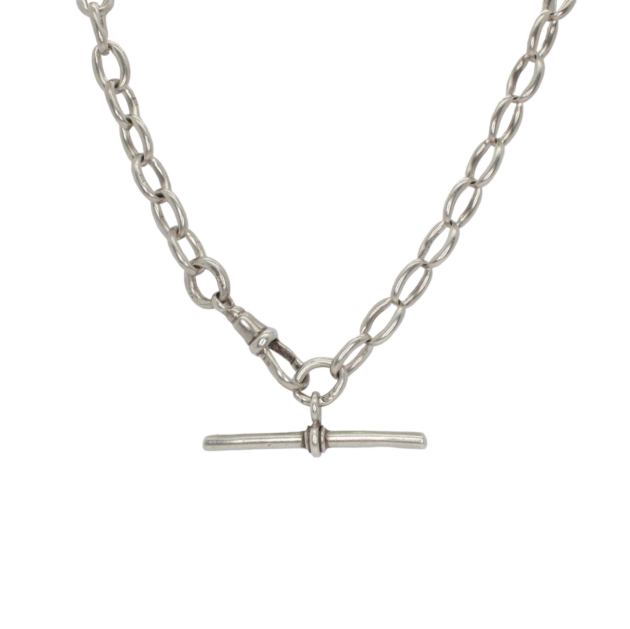 This heavy sterling silver chain features solid links about 6.5mm across. This piece weights 34 grams and includes a large toggle charm