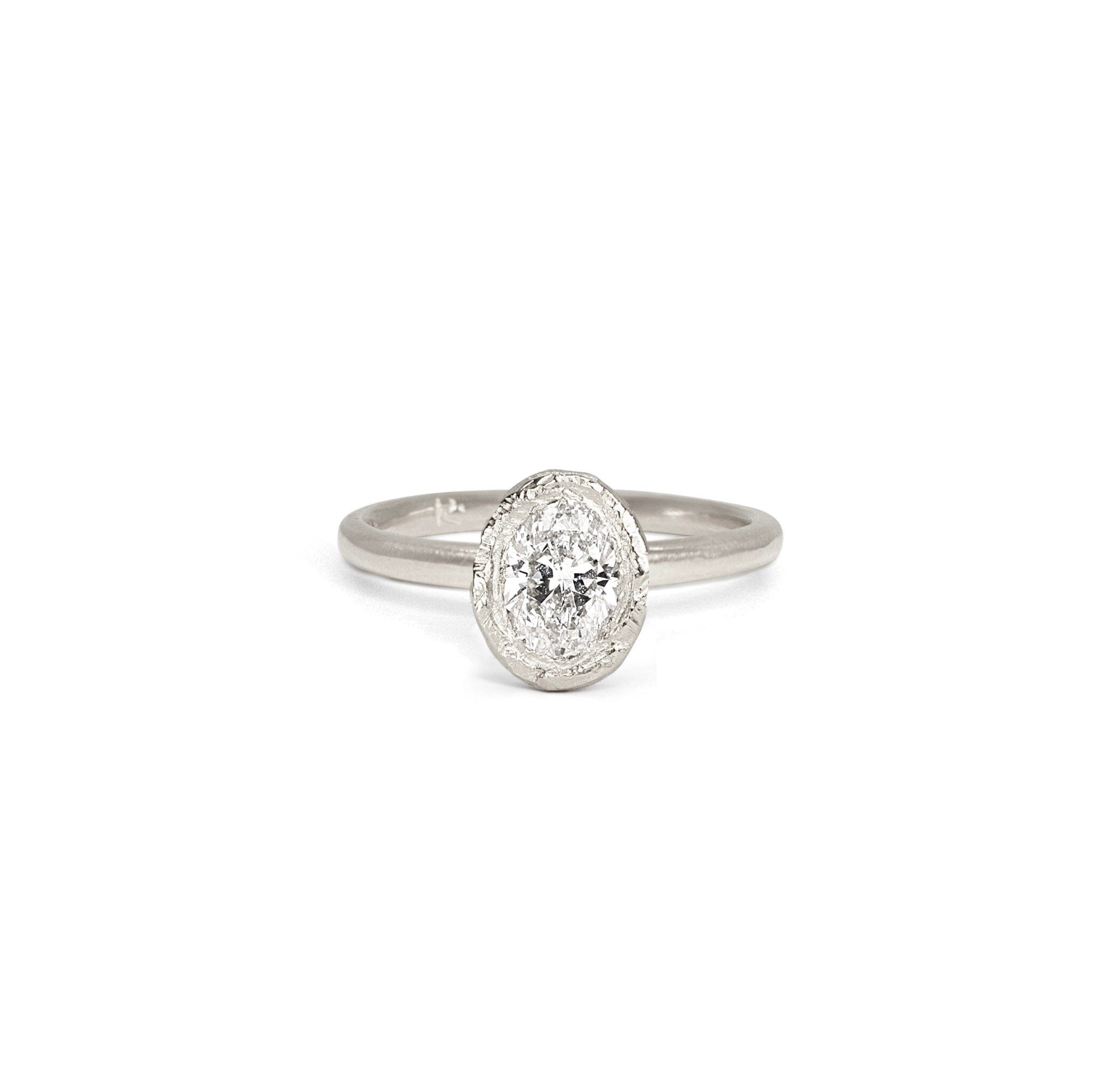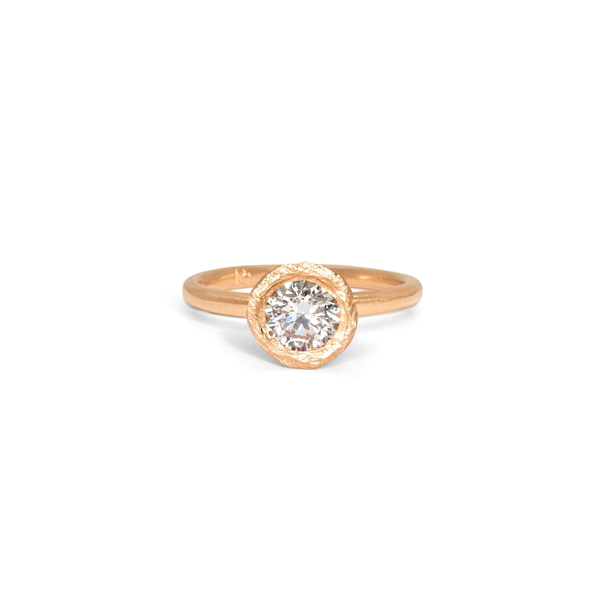 The Smith is the perfect blend of sculptural and classic engagement ring style, it features a signature hand carved textured bezel setting which sits on a smooth rounded ring band, lifted to stack perfectly with a wedding band of your choice.