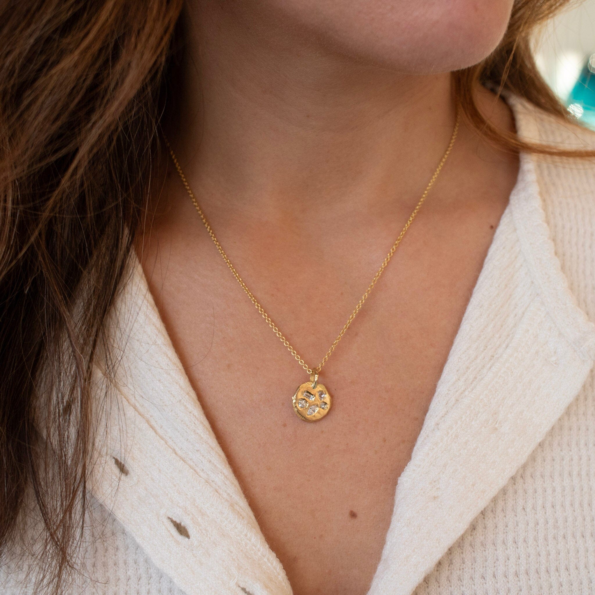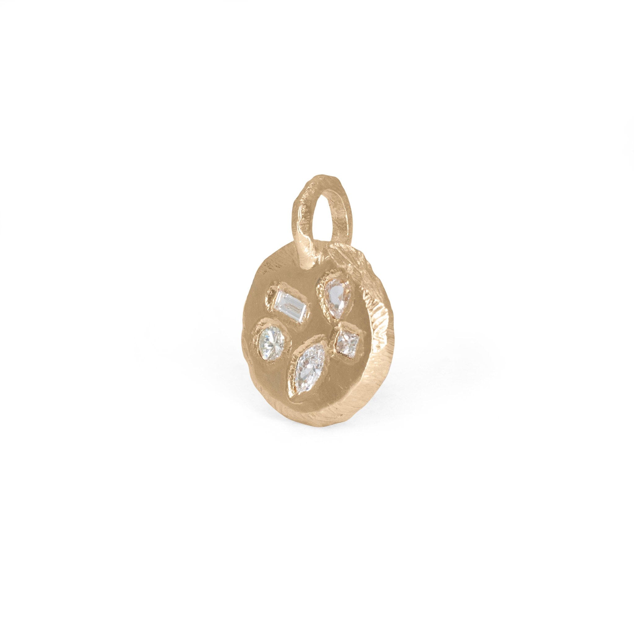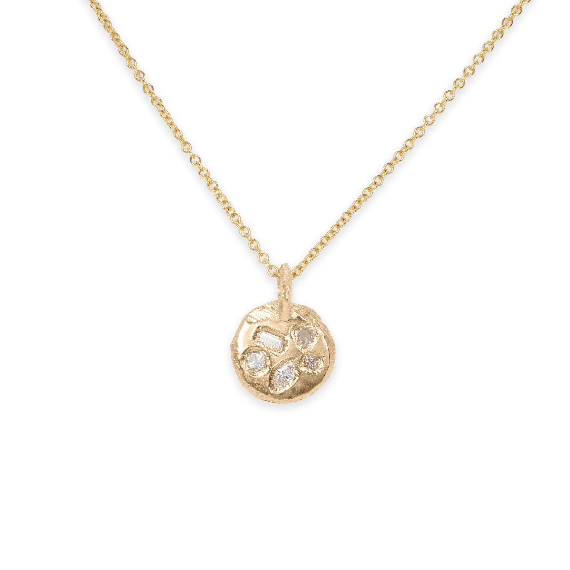 A one of a kind tablet pendant featuring a selection of sparkling geometric diamonds set into a hand carved pendant with a smooth surface and our signature textured border. Chain is sold separately. Add this pendant to a chain in your own collection or select one from ours.