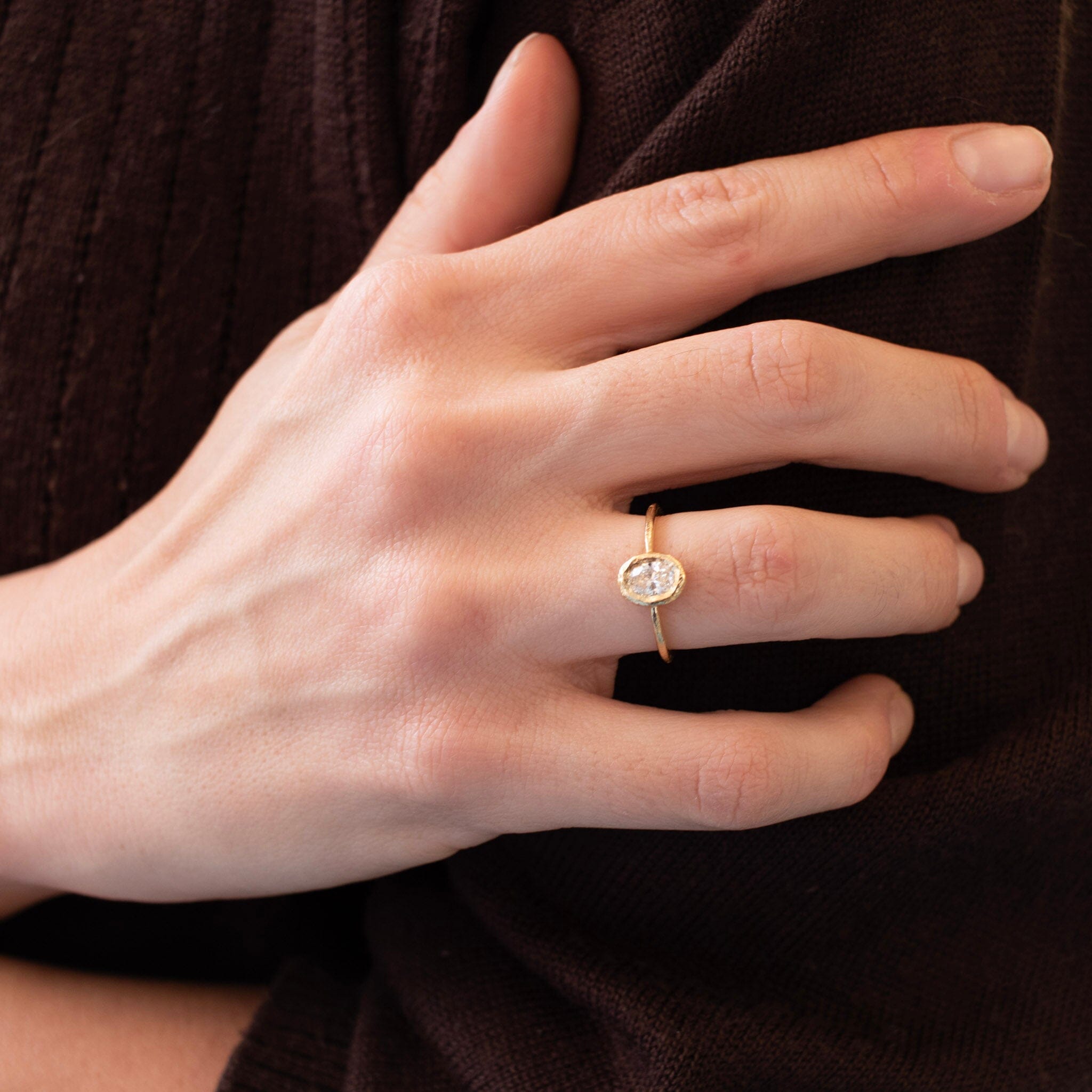 An elegant and timeless oval solitaire diamond is paired with our signature textured carved bezel and slender band for the perfect blend of sparkle and sculpture.